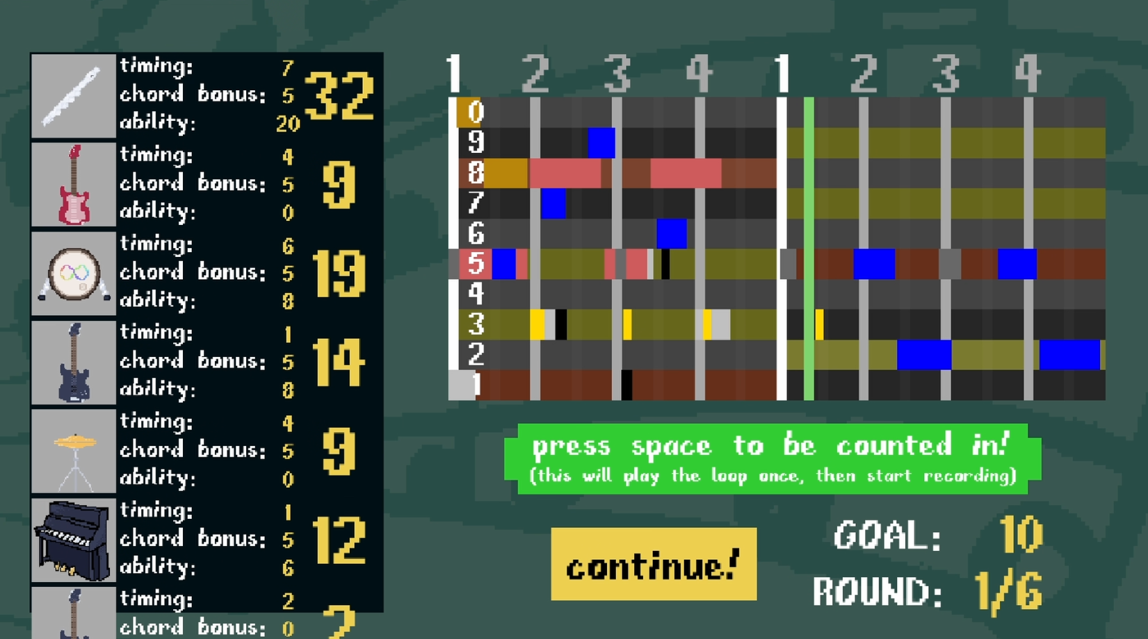 okay this is the end state of any given round. that goal in the bottom right is what you're trying to reach and the total is what you have reached. it'll automatically tally these up once you've played all but one of your instrument cards. that little grid represents the loop that you're going to be recording over and when you press space. it's going to run through that loop once and once it's done it'll run through the loop a second time and that run through your inputs will be recorded. the numbers 1 through 0 on your keyboard will play notes from the instrument you've currently selected and once you've done playing that's it, that's recorded in and you move on to another instrument. so the little blue and black rectangles other notes that you have played, the white lines are the beats and the colors in the background represent the chords that are going to be playing in the background. the orange notes specifically are the root notes of the chord which is sometimes important for certain game effects, but all of them count as chord notes. if 50% or more of any given instruments notes played within the cause you get a little bonus but the main way you're going to score points is by timing well and using your instruments’ abilities. on the next slide i'm just going to show you those beats that i mentioned earlier, illustrated. you can just hit right arrow to skip to that and then right again to go back to the main menu. i hope you have a good time thank you so much for listening!!